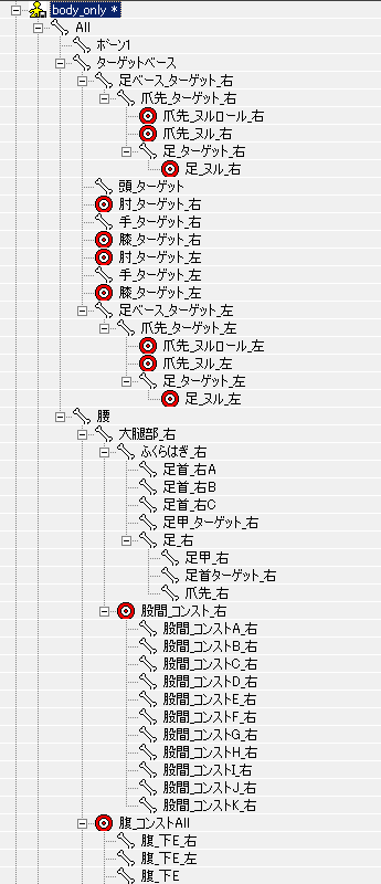 足と重なるボーンは膝の向きの制御用で、この辺のが新しくなってたり